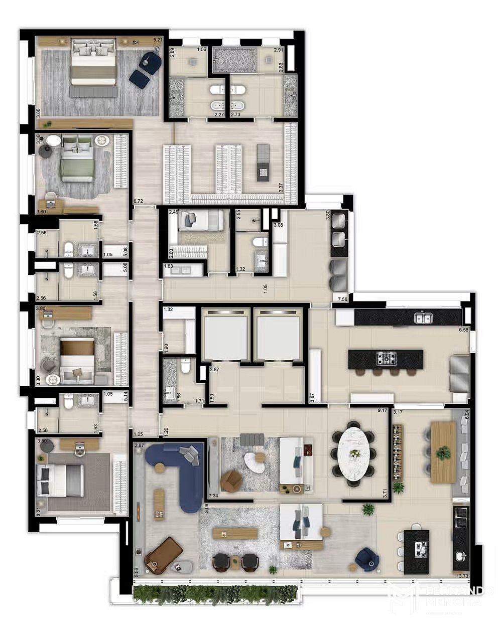 O projeto contempla unidades amplas e exclusivas com 3 e 4 suítes, incluindo plantas tipo de 277 m² e 342 m², além de coberturas duplex, com layouts inteligentes, integração entre ambientes e soluções voltadas ao conforto e à personalização.